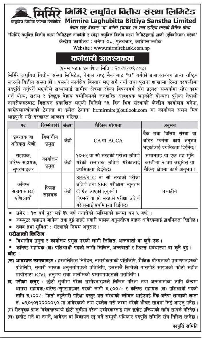 काठमाडौं । मिर्मिरे लघुवित्त वित्तीय संस्थाले विभिन्न पदका लागि कर्मचारीको माग गरेको छ । संस्थाले विभागिय प्रमुखका लागि केही, कार्यालय प्रमुखका लागि केही र फिल्ड सहायकका लागि केही संख्यामा कर्मचारीको माग गरेको जनाएको छ ।