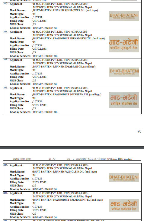 असोज २२ गते प्रकाशन उद्योग विभागद्वारा प्रकाशन गरिएको औद्योगिक सम्पत्ति बुलेटिनको वर्ष १७ अंक ८ मा भाटभटेनी नामको ब्राण्डमा आरएमसी फुड्स जीतपुर सिमराले भाटभटेनी प्रशोधित पामोलिन तेल, प्रशोधित सोयाबिन तेल र प्रशोधित सूर्यमुखी तेलकाे ब्राण्ड दर्ता गराएको उल्लेख छ । बुलेटिनमा सूचना प्रकाशन भएकाे ९० दिनभित्र दाबीविराेध गर्न चुकेमा गुरुङले याे बौद्धिक सम्पत्ती गुमाउनुपर्नेछ।