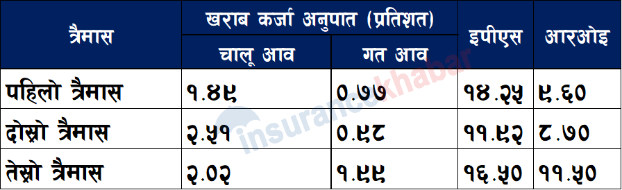 चालु आवको पहिलो त्रैमासमा १.४९ प्रतिशत रहेको खराब कर्जा अनुपात तेस्रो त्रैमाससम्म बढेर २.०२ प्रतिशत पुगेको छ। चालु आवकै दोस्रो त्रैमासमा बैंकको खराब कर्जा अनुपात २.५१ प्रतिशत पुगेको थियो।