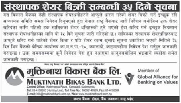 काठमाडौं । मुक्तिनाथ विकास बैंक लिमिटेडले संस्थापक शेयर बिक्री गर्ने भएको छ । बैंकले एक सूचना प्रकाशन गर्दै बेंकले स.स्थापक शेयर विक्री गर्न लागेको जनाएको छ ।