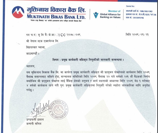 बैंकले बैंकिङ्ग क्षेत्रको अनुभव र कार्य दक्षताको आधारमा २०७९ जेठ १ गतेबाट ४ वर्षको कार्यकाल रहने गरी उनलाई पुनः प्रमुख कार्यकारी अधिकृतमा नियुक्त गर्ने निर्णय गरेको हो।