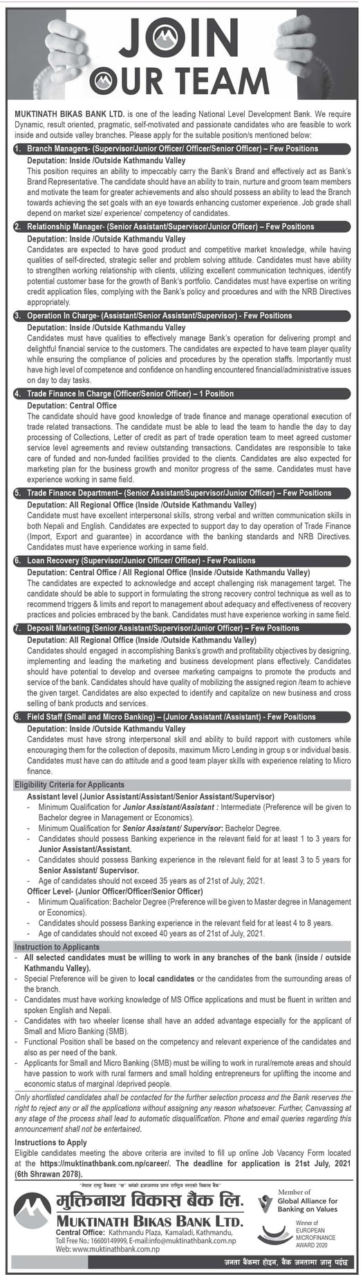काठमाडौं । मुक्तिनाथ विकास बैंक लिमिटेडले विभिन्न आठ पदका लागि कर्मचारी माग गरेको छ । बैंकले ब्रान्च म्यानेजर, रिलेशनसिप म्यानेजर, ओपरेशन इन्चार्ज, ट्रेड फाईनान्स इन्चार्ज, ट्रेड फाइनान्स डिपार्टमेन्ट, लोन रिकभरी, डिपोजिट मार्केटिङ र फिल्ड स्टाफका लागि कर्मचारी माग गरेको जनाएको छ ।