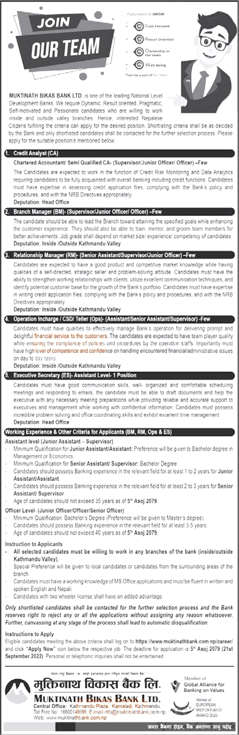 काठमाडौं । मुक्तिनाथ विकास बैंकले विभिन्न पदका लागि कर्मचारीको माग गरेको छ । बैंकले चार्टड एकाउन्टेन्टका लागि केही, ब्रान्च म्यानेजरका लागि केही, रिलेसनसिप म्यानेजरका लागि केही, अप्रेसन इन्चार्जका लागि केही, एक्जुकेटिभ सेक्रेटरी पदका लागि १ जना कर्मचारी माग गरेको छ ।