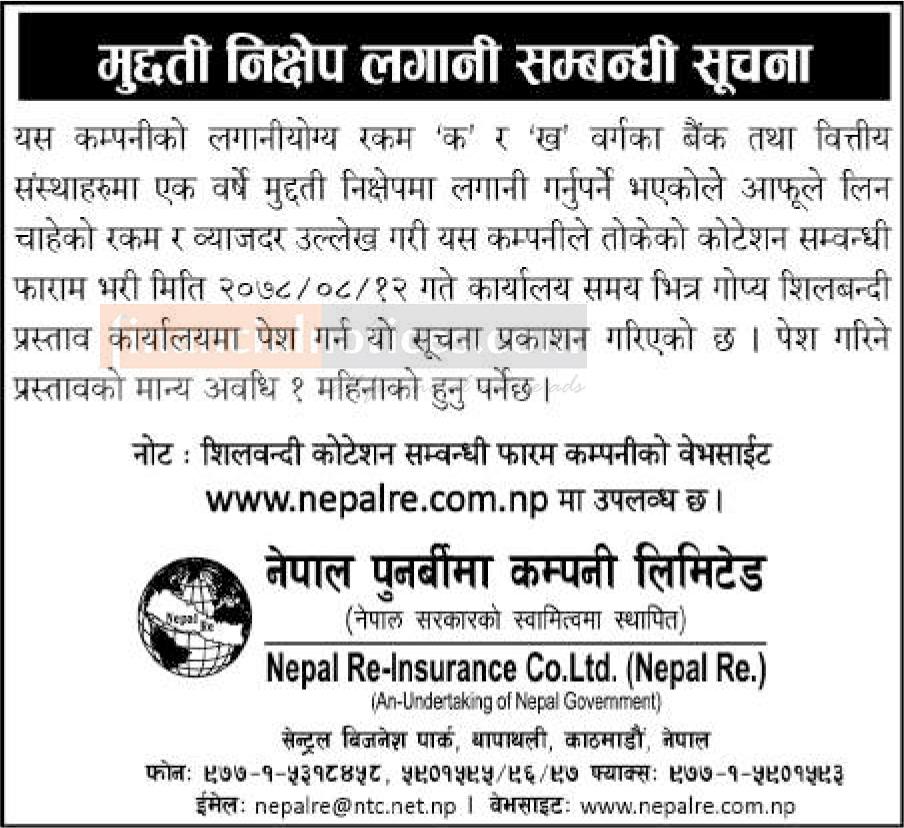 काठमाडौं । नेपाल पुनर्बीमा कम्पनी लिमिटेडले मुद्दती निक्षेप लगानी गर्ने भएको छ । कम्पनीले एक सुचना जारी गर्दै आफ्नो कम्पनीमा भएको लगानीयोग्य रकम क र ख वर्गका बैंक तथा वित्तीय संस्थाहरुमा १ वर्ष अवधिका लागि लगानी गर्नुपर्ने भएकाले आफुले चाहेको रकम र ब्याजदर उल्लेख गरी कम्पनीले तोकेको कोटेशन सम्बन्धी फाराम भरी पठाउन आग्रह गरेको छ ।