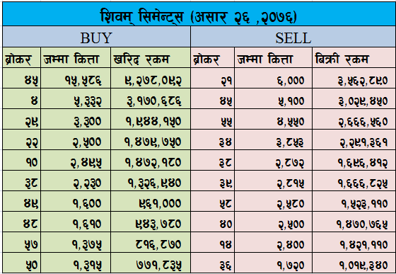 बजार मूल्य २ प्रतिशतले घटेपनि आज शिवम् सिमेन्टको शेयरमा खरिद गर्ने ब्रोकरनै आक्रामक भएको देखिन्छ। आज दिन भरमा शिवम सिमेण्ट्सको दिन भरमा ३ करोड २० लाख बराबरको शेयर किन बेच भएको छ।