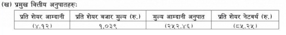 कम्पनीको वार्षिकीकृत प्रतिशेयर आम्दानी (ईपीएस) ४.१२ रुपैयाँ र प्रतिशेयर नेटवर्थ ८५.२५ रुपैयाँले ऋणात्मक रहेको छ। मंगलबार अन्तिम कारोबार मूल्यअनुसार कम्पनीको प्रतिकित्ता शेयरभाउ १ हजार ४० रुपैयाँ रहेको छ।