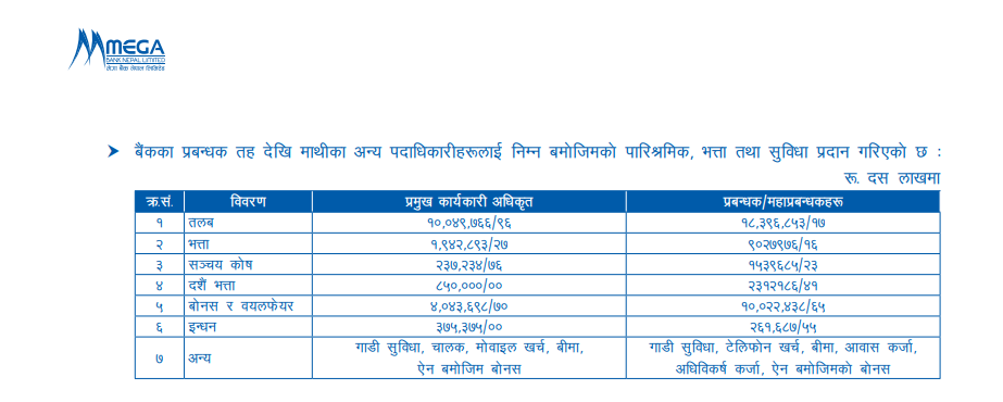 मेगा बैंककी सिइओ खुञ्जेलीले कार्यकालको अन्तिम वर्षमा बुझिन् एक करोड ७४ लाख