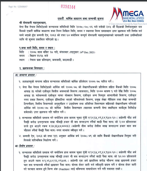 त्यसैगरी सभाले अध्यक्षको मन्तव्य सहित सञ्चालक समितिको वार्षिक प्रतिवेदन २०७७/७८ पारित गर्ने, मेगा बैंक नेपाल लिमिटेडको आर्थिक वर्ष २०७७/७८ को लेखापरीक्षकको प्रतिवेदन सहित बैंकको मिति २०७८ आषाढ ३१ गतेको एकीकृत वित्तीय अवस्थाको विवरण (वासलात), मिति २०७७ श्रावण १ गते देखि मिति २०७८ आषाढ ३१ गतेसम्मको एकीकृत नाफा नोक्सान विवरण, एकीकृत अन्य विस्तृत आम्दानीको विवरण पारित जनाएको छ । ।