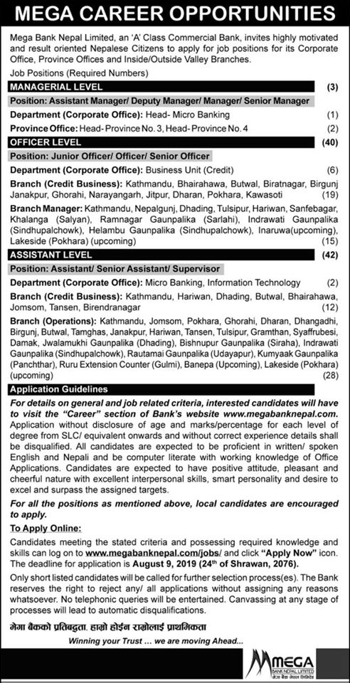 काठमाडौं । मेगा बैंकले विभिन्न पदका लागि कर्मचारीको माग गरेको छ । बैंकले ८५ जना कर्मचारीको मग गरेको हो । बैंकले जनरल लेभल ९ असिस्टेन्ट म्यानेजर,डेपुटी म्यानेजर, म्यानेजर र सिनियर म्यानेजरका लागि ३ जना, अफिसर लेभल –जूनियर अफिसर, अफिसर र सिनियर अफिसरका लागि ४० जना, असिस्टेन्ट लेभल ९असिस्टेन्ट,सिनियर असिस्टेन्ट र सूपरभाइजर० का लागि ४२ जना गरी ८६ जना कर्मचारीको माग गरेको हो ।