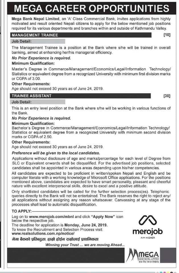 मेगा बैंकले विभिन्न पदमा कर्मचारी माग गरेको छ । बैंकले म्यानेजमेन्ट ट्रेनि पदमा १० जना र ट्रेनि एसिस्टेन्ट पदमा ३० जना कर्मचारी माग गरेको हो ।