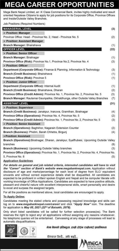 काठमाडौं । मेगा बैंकले विभिन्न पदका लागि ५६ जना कर्मचारीहरु माग गरेको छ ।बैंकले ७ वटै प्रदेशमा रहेका आफ्ना शाखाहरु लागि आवश्यक कर्मचारी मागेको हो ।