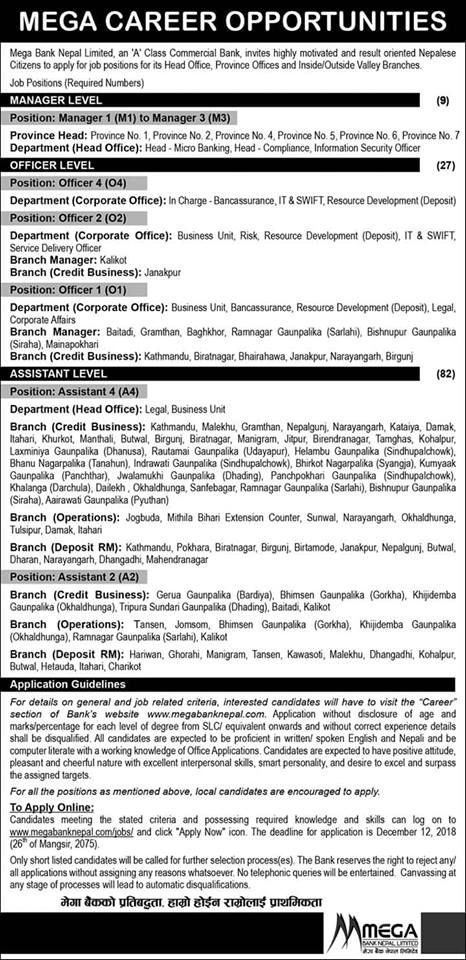 मेगा बैंकले विभिन्न पदका लागि कर्मचारीको माग गरेको छ । बैंकले म्यानेजर पदका लागि ९ जना, अफिसर पदका लागि २७ जना र सहायक पदको लागि ८२ जना कर्मचारी माग गरेको छ ।