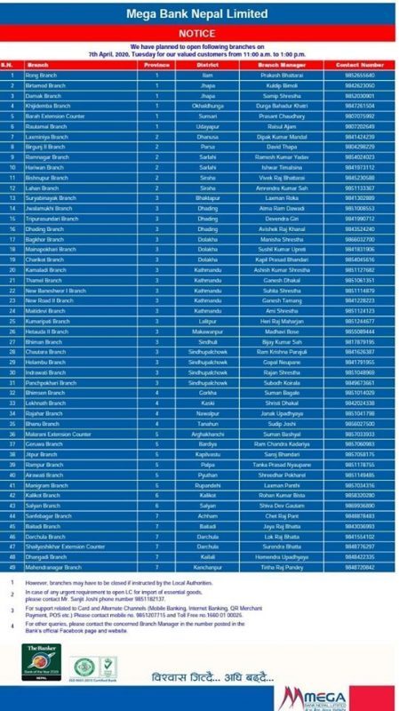 काठमाडौं । आज मेगा बैंक नेपाल लिमिटेडले विभिन्न ४९ वटा शाखा कार्यालयबाट सेवा दिने भएको छ । लकडाउनको समयमा नागरिकको सुविधालाई ध्यानमा ाखी बैंकले यी शाखा कार्यालयबाट सेवा दिनै भएको हो ।