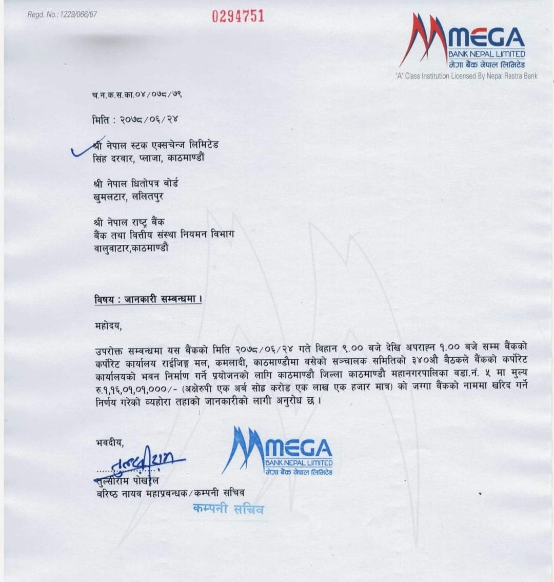 आज विहान ९ बजेदेखि अपरान्ह १ बजेसम्म बसेको सञ्चालक समितिको बैठकले बैंकको नाममा जग्गा गरिद गर्ने निर्णय गरेको हो । बैंकको कर्पोरेट कार्यालय राईजिङ मल कमलादीमा रहेको छ ।