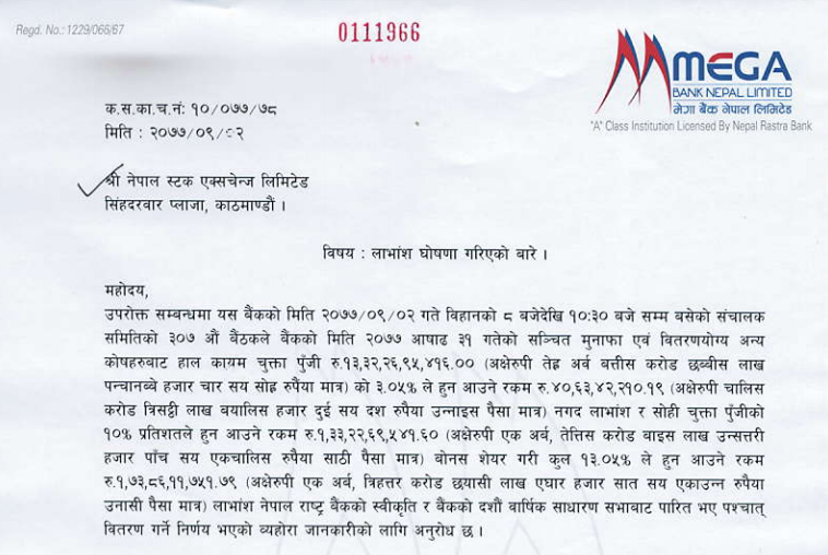 मेगा बैंकले गर्यो १३.०५% लाभांश घोषणा