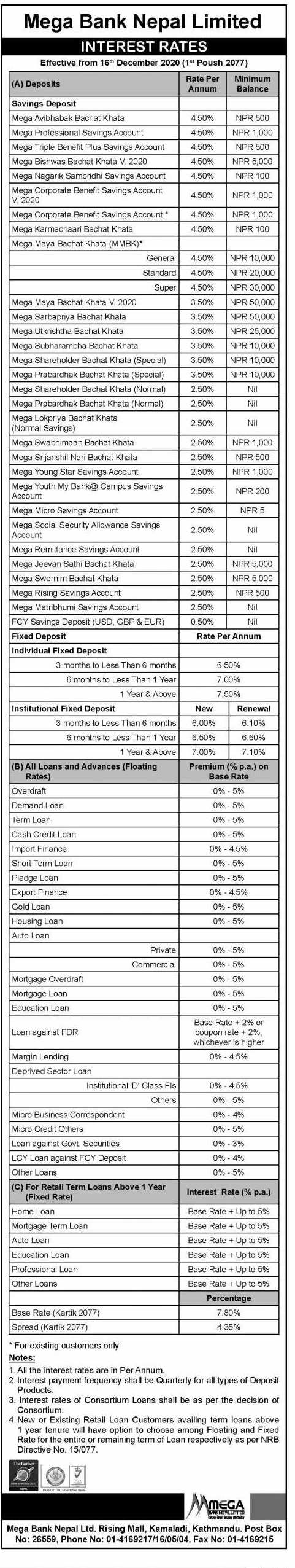 काठमाडौं । मेगा बैंक नेपाल लिमिटेडले नयाँ व्याजदर सार्वजनिक गरेको छ । बैंकले विभिन्न खातामा आज पुस १ गतेबाट लागू हुने गरी नयाँ व्याजदर सार्वजनिक गरेको हो ।