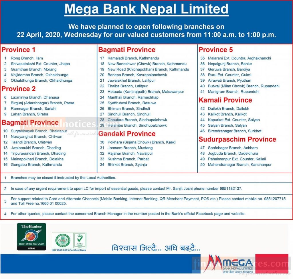 काठमाडौं । मेघा बैंकले लकडाउनलाई मध्यनजर गर्दै आज (वुधवार) ५० वटा शाखा खुल्ला गर्ने भएको छ। बैंकले सातैवटा प्रेदशमा ११ बजेदेखि १ बजेसम्म उक्त शाखाहरु संचालनमा रहने बैंकले जनाएको छ।