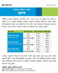 मेट लाइफले बीमालेखमा प्रति हजार न्यूनतम ४५ देखि अधिकतम ८० रुपैयाँसम्मको बोनसदर कायम गरेको छ । कम्पनीले हाल कायम गरिएको बोनसदर मृत्यु दाबी, चुक्ता मूल्य दावी, अवधि भुक्तानी दावी र चालु बीमालेखहरुमा लागू हुनेछ । साथै अर्काे बीमाङ्कीय मूल्याङ्कन अनुसार बीमा समितिबाट अर्काे व्यवस्था गर्न स्वीकृत नभएसम्म उल्लेखित दावीहरुमा सोहि बोनसदर लागू हुने कम्पनीले जनाएको छ ।