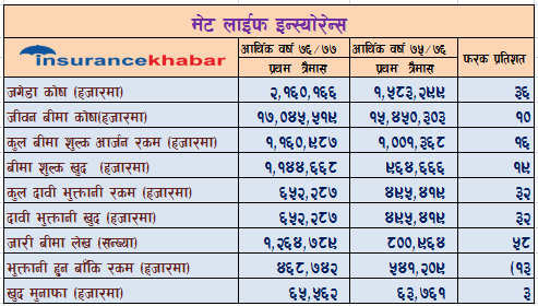 मेट लाईफ इन्स्योरेन्सले चालु आर्थिक वर्षको प्रथम त्रैमासको वित्तीय विवरण सार्वजनिक गरेको छ। कम्पनीले चालु आर्थिक वर्षको प्रथम त्रैमासमा ६ करोड ५५ लाख खुद नाफा गरेको छ। गत वर्ष सोही अवधिमा कम्पनीले ६ करोड ३७ लाख कमाएको थियो। कम्पनीको जगेडा कोष ३६ प्रतिशतले वृद्धि हुँदै २ अर्ब १६ करोड पुगेको छ भने जीवन बीमा कोष १० प्रतिशतले वृद्धि हुँदै १७ अर्ब ४ करोड पुगेको छ।