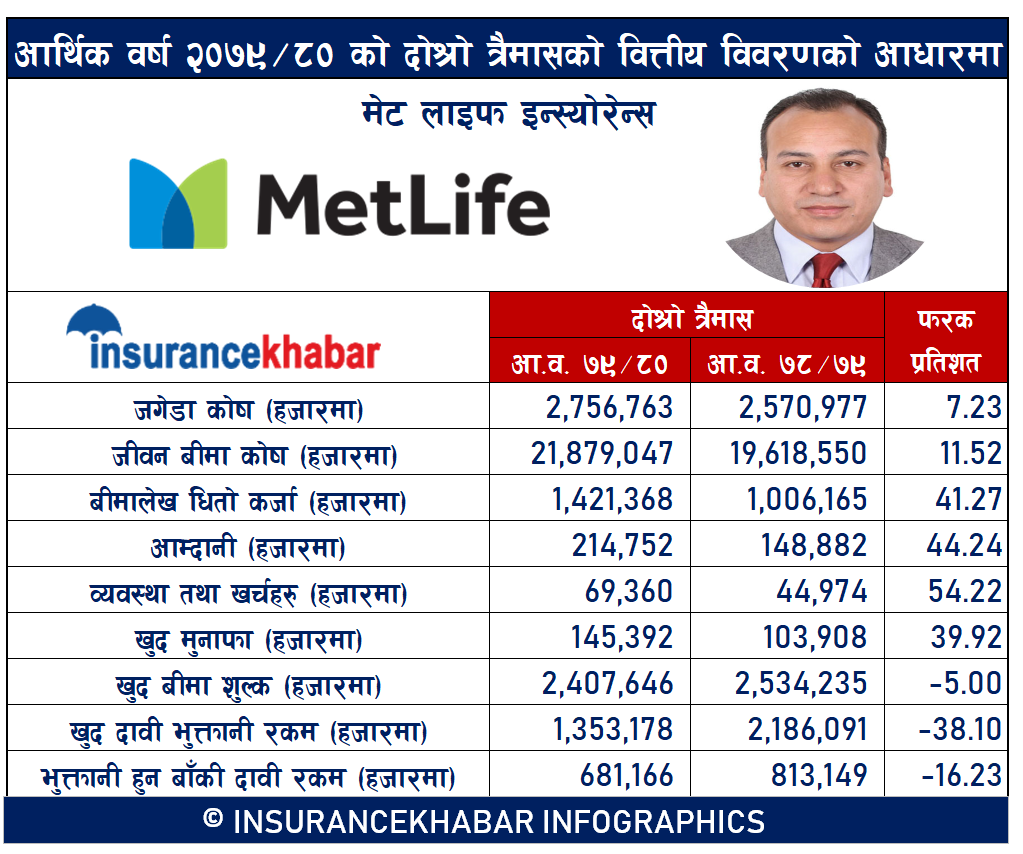काठमाडौं । मेट लाइफ इन्स्योरेन्सले चालु आर्थिक वर्ष ७९/८० को दोश्रो त्रैमासको वित्तीय प्रतिवेदन सार्वजनिक गरेको छ । प्रकाशित तथ्यांक अनुसार कम्पनीले गत आर्थिक वर्षको दोश्रो त्रैमासको तुलनामा ३९ दशमलव ९२ प्रतिशत धेरै खुद नाफा गर्न सफल भएको छ । कम्पनीले अहिले दोश्रो त्रैमाससम्म १४ करोड ५३ लाख खुद नाफा गर्दा गत आर्थिक वर्षको दोश्रो त्रैमाससम्म १० करोड ३९ लाख खुद नाफा गरेको थियो ।