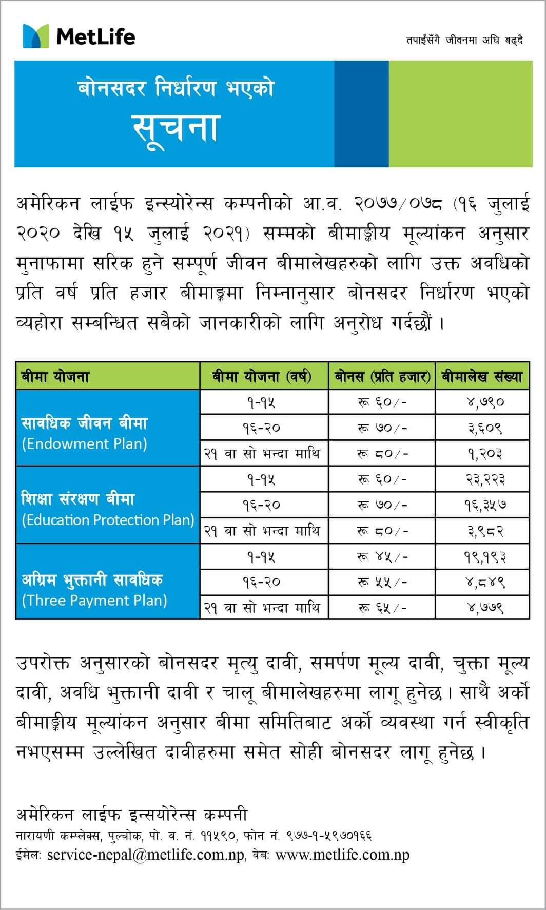 काठमाडौं । मेट लाइफ इन्स्योरेन्स कम्पनीले आर्थिक वर्ष २०७७/७८ को बोनसदर घोषणा गरेको छ । कम्पनीको आर्थिक वर्ष २०७७/२०७८(१६ जुलाई २०२० देखि १५ जुलाई २०२१) सम्मको आर्थिक लेखाजोखा र दायित्वको मुल्याङकन सम्बन्धी बिमाङ्कीय प्रतिवेदन बीमा समितिबाट पारित भएसँगै कम्पनीबाट जारी बीमालेखहरुमा उक्त बोनसदर कायम हुने गरी सार्वजनिक गरेको हो ।
