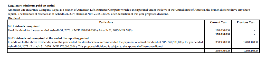 कम्पनीले गत असोज मै बीमा समितिबाट एक्चुरियल भ्यालुएसन स्वीकृत गराएको थियो । उक्त भ्यालुएसन पछि शेयरधनीहरुका लागि वितरण योग्य मुनाफ मध्येबाट १२ करोड ९ लाख रुपैयाँ जगेडा कोषमा जम्मा गरेर बाँकी रहेको ३५ करोड रुपैयाँ लाभांशको रुपमा पठाउने प्रस्ताव गरेको हो । कम्पनीले यस भन्दा अघिल्लो आर्थिक वर्षमा १७ करोड रुपैयाँ नगद लाभांश दिएको थियो ।