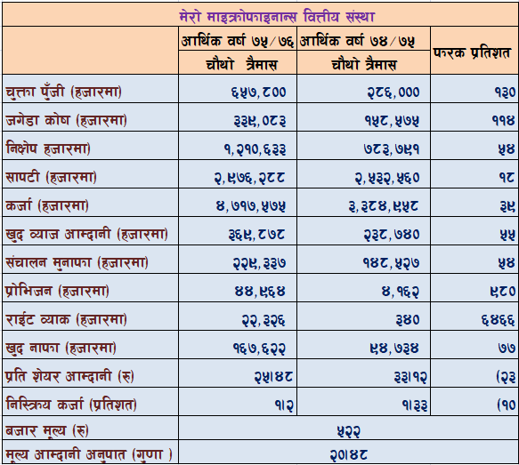 मेरो माइक्रोफाइनान्स वित्तीय संस्थाले आर्थिक वर्ष २०७५/ ७६ को चौथो त्रैमासको वित्तीय विवरण प्रकाशित गरेको छ । लघुवित्तले आर्थिक वर्ष २०७५ /७६ को १२ महिनामा १६ करोड ७६ लाख रुपैयाँ खुद नाफा कमाएको छ । गत आर्थिक वर्षको सोही अवधिमा लघुवित्तले ९ करोड ४७ लाख रुपैयाँ खुद नाफा कमाएको थियो । गत आर्थिक वर्षको सोही अवधिको तुलनामा लघुवित्तको नाफा ७७ प्रतिशतले बढी हो ।