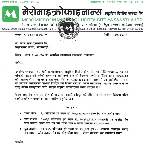 कम्पनीले हाल कायम चुक्ता पूँजी १ अर्ब रुपैयाँको २० प्रतिशतले हुन आउने २० करोड रुपैयाँ बराबरको बोनश शेयर र कर प्रयोजनको लागि १ दशमलव ०५२६ प्रतिशतले हुन आउने १ करोड ५ लाख २६ हजार ३ सय १६ रुपैयाँ बराबरको नगद लाभांश गरि कुल २१ दशमलव ०५२६ प्रतिशतले हुन आउने २१ करोड ५ लाख २६ हजार ३ सय १६ रुपैयाँ बराबरको लाभांश वितरण गर्ने प्रस्ताव गरेको हो ।