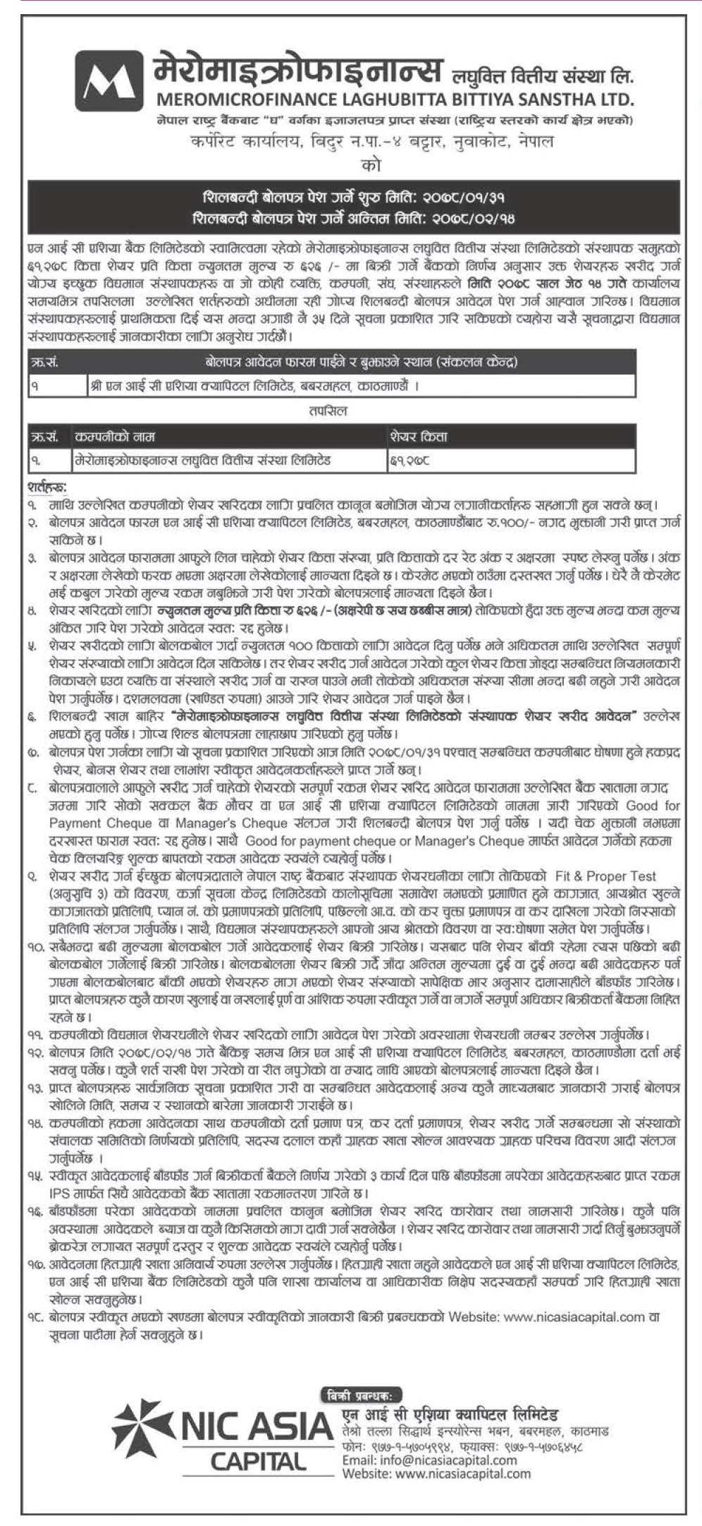 काठमाडौँ । एनआईसी एशिया बैंक लिमिटेडको स्वामित्वमा रहेको मेरो माइक्रोफाइनान्स लघुवित्त वित्तीय संस्था लिमिटेडको संस्थापक समूहको शेयरमा आवेदन दिने आज अन्तिम दिन रहेको छ । बैंकले संस्थाको ६१ हजार २ सय ७८ कित्ता कित्ता संस्थापक समूहको शेयर बैशाख ३१ गते, शुक्रबारबाट लिलाम बढाबढ गरी बिक्री खुल्ला गरेको थियो । उक्त शेयरको न्युनतम मूल्य ६ सय २६ रूपैयाँ तोकिएको छ ।