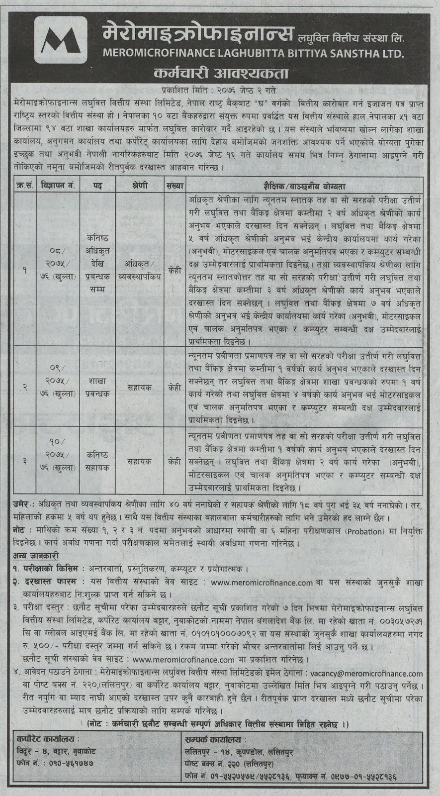 मेरो फाइक्रोफाइनान्स लघुवित्त वित्तीय संस्था लिमिटेडमा रोजगारी खुलेको छ । फाइनान्सले बिहिबार एक विज्ञापन जारी गर्दै विभिन्न पदका लागि केही कर्मचारी माग गरेको हो ।