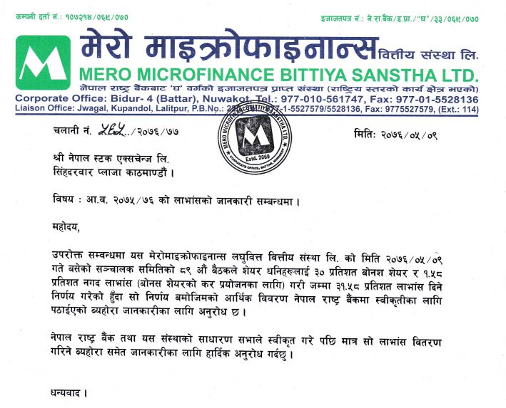 काठमाडौं । मेरो माइक्रोफाइनान्स वित्तीय संस्थाले ३१ दशमलव ५८ प्रतिशत लाभांश दिने घोषणा गरेको छ । कम्पनीको भदौ ९ गते बसेको सञ्चालक समिति बैठकले २०७५–७६ को नाफाबाट ३० प्रतिशत बोनस र १ दशमलव ५८ प्रतिशत नगद वितरण गर्ने निर्णय गरेको हो ।