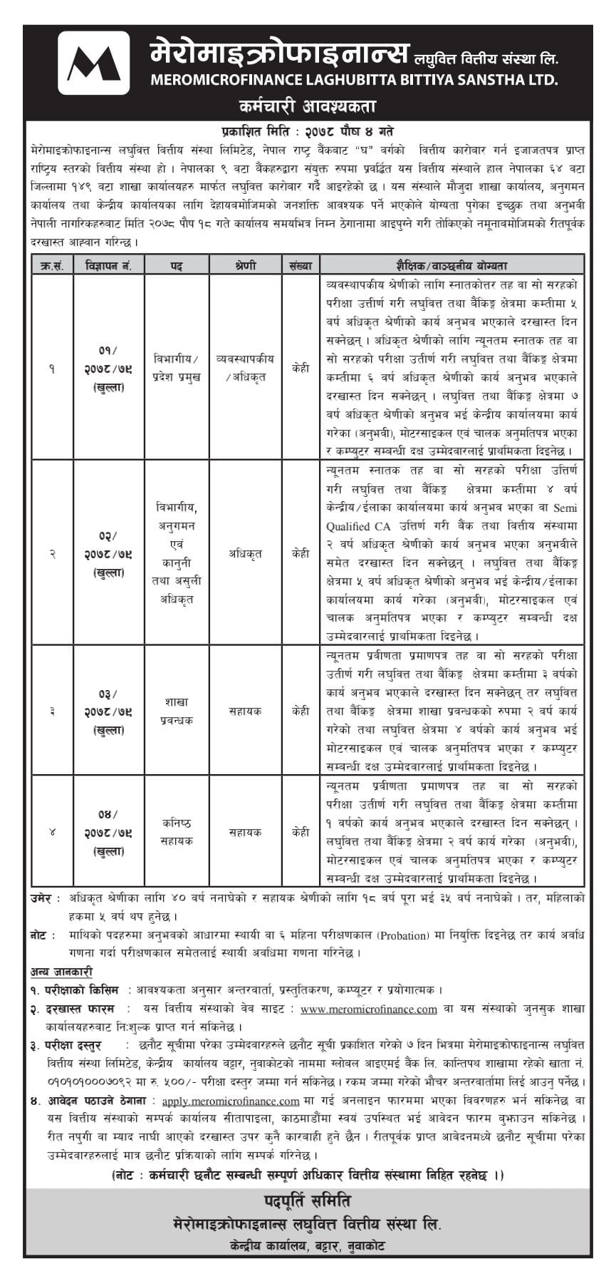 कम्पनीले आफ्नो विभिन्न शाखा कार्यालय तथा आफ्नो केन्द्रीय कार्यालयका लागि कर्मचारीको माग गरेको हो । ईच्छुक तथा योग्यता पुगेकाले पुस १८ गते कार्यालय समयभित्र आवेदन दिनुपर्नेछ ।