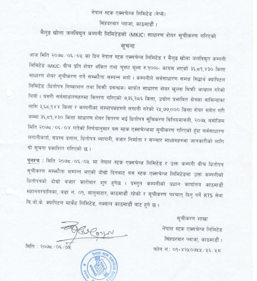 काठमाडौं । नेपाल स्टक एक्सचेन्जमा मैलुङ खोला जलविद्युत् कम्पनी लिमिटेडको साधारण शेयर सूचिकृत भएको छ । कम्पनीको ३६ लाख ८१ हजार ४३० कित्ता शेयर सूचिकृत भएको हो । नेप्सेले कम्पनीलाई कारोबारको लागि एमकेजेसी (MKJC) सिम्बोल प्रदान गरेको छ ।