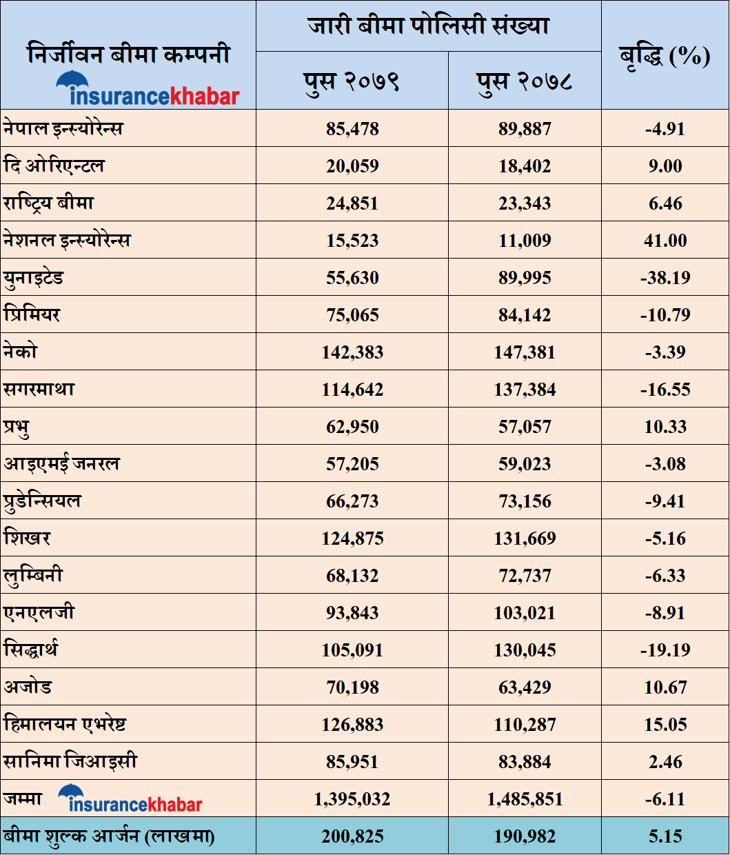 चालु आर्थिक वर्षको पुस मसान्तसम्ममा निर्जीवन बीमा कम्पनीहरुले १३ लाख ९५ हजार पोलिसी जारी गरेका छन् । गत वर्षको यहि अवधिमा १४ लाख ८५ हजार वटा पोलिसी जारी भएको थियो । यस अवधिमा संख्यात्मक रुपमा ९० हजार ८१९ वटा पोलिसी घटेको छ ।