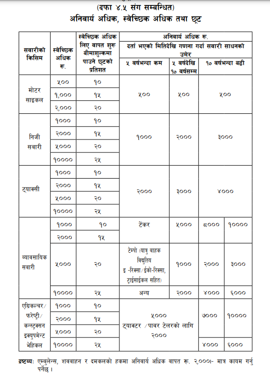चारपांग्रे सवारीसाधनको बीमामा अनिवार्य अधिकको सीमा निजी सवारीसाधनको आयुका आधारमा १ हजारदेखि ३ हजार रुपैयाँसम्म निर्धारण गरिएको छ। यसैगरी सार्वजनिक चारपांग्रे सवारीको हकमा २ देखि ४ हजार रुपैयाँसम्म अनिवार्य अधिकको सीमा तय गरिएको छ।