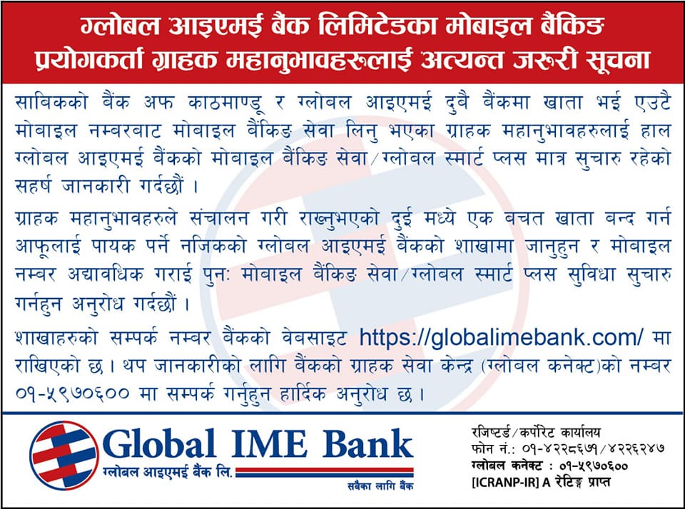 काठमाडौं । ग्लोबल आइएमई बैंक लिमिटेडले मोबाईल बैंकिङ प्रयोगकर्तालाई ग्लोबल स्मार्ट प्लसबाट मात्र शूचारु रहेको बैंकले जनाएको छ । बै.कले एक सुचना जारी गर्दै साविकको बैंक अफ काठमाण्डु र ग्लोबल आइएमई दुबै बैंकमा खाता भई एउटै मोबाईल नम्बरबाट मोबाईल बैंकिङ सेवा लिइरहेका ग्राहकलाई बैंकले हाल ग्लोबल आइएमई बैंकको मोबाईल बैंकिङ सेवा सुचारु गरी ग्लोबल स्मार्ट प्लस एप्स चलाउन आग्ह गरेको हो ।