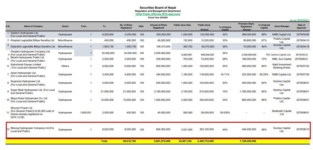 मोलुङ्ग हाइड्रोपावरले आइपीओ निष्काशन गर्न बोर्डबाट पायो अनुमति