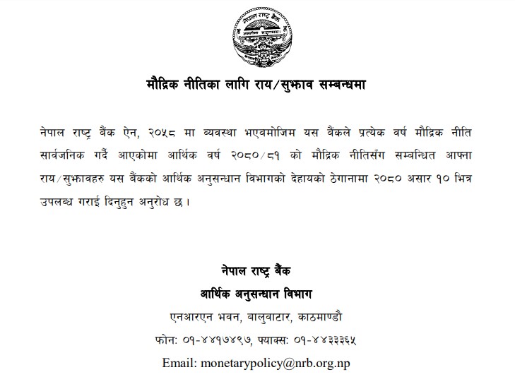 बैंकले प्रत्येक वर्ष मौद्रिक निति सार्वजनिक गर्दै आएको छ । आर्थिक वर्ष २०८० ८१ को मोद्रिक नितिसँग सम्बन्धित आफ्ना राय सुझावहरु बैंकको आर्थिक अनुसन्धान विभागमा आइपुग्ने गरि २०८० असार १० गतेभित्र उपलब्ध गराउन बैंकले अनुरोध गरेको हो ।