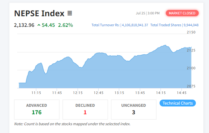सोमबार नेप्से सूचक ५४.४५ अंकले सुधार भएर २१३२.९६ अंक कायम भएको छ । सूचक २.६२ प्रतिशतले सुधार हुँदा कारोबार रकममा पनि उल्लेख्य सुधार देखिन्छ । आज मात्रै ४ अर्ब १० करोडको कारोबार भएको छ । १७६ वटा कम्पनीको शेयर मूल्यमा सुधार आउदा एउटाको मात्रै मूल्य घटेको छ भने १२ वटा कम्पनीको शेयर मूल्य सर्वाधिक धेरै बढ्ने क्रममा सकारात्मक सर्किट लागेको छ ।