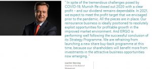 कम्पनीले सन् २०२० मा २.८ अर्ब युरो नाफा गर्ने लक्ष्य लिएको थियो। तर कोभिड १९ का कारण सफल हुन नसकेको कम्पनीले जनाएको छ। प्राकृतिक विपत्तीका कारण कम्पनीको पुनर्बीमा व्यवसायमा ९० करोड ६० लाख युरोको नोक्सानी देखिएको छ।