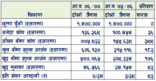 कम्पनीले ४ करोड ६५ लाख खुद मुनाफा गरेकोमा खुद मुनाफा गत आर्थिक वर्षको दोश्रो त्रैमासको तुलनामा ९३ प्रतिशतले वृद्धि भएको छ। कम्पनीको वार्षिक प्रति शेयर आम्दानी ६ रुपैया ३४ पैसा छ।