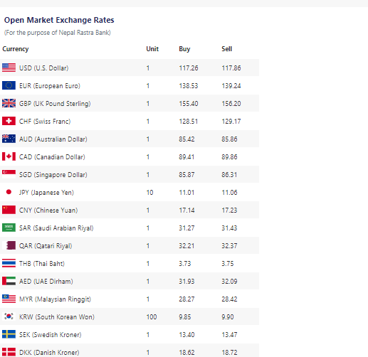 त्यस्तै, एक यूरोपियन यूरोको बिक्रिदर १ सय ३८ रुपैयाँ ५३ पैसा रहेको छ भने खरिददर १ सय ३९ रुपैयाँ २४ पैसा रहेको छ । एक यूके पाउन्डको बिक्रिदर १ सय ५५ रुपैयाँ ४० पैसा र खरिददर १ सय ५६ रुपैयाँ २० पैसा रहेको छ।
