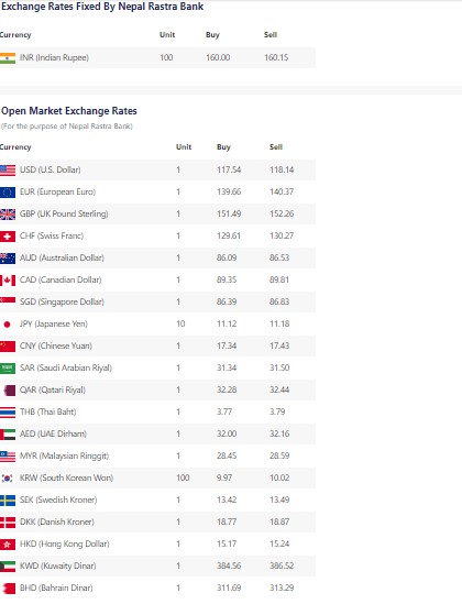 त्यस्तै, एक यूरोपियन यूरोको बिक्रिदर १ सय ३९ रुपैयाँ ६६ पैसा रहेको छ भने खरिददर १ सय ४० रुपैयाँ ३७ पैसा रहेको छ । एक यूके पाउन्डको बिक्रिदर १ सय ५१ रुपैयाँ ४९ पैसा र खरिददर १ सय ५२ रुपैयाँ २६ पैसा रहेको छ ।