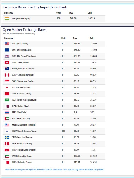 त्यस्तै, युरो एकको खरिददर १ सय ४० रुपैयाँ ३२ पैसा र बिक्रीदर १ सय ४१ रुपैयाँ ३ पैसा रहेको छ । यसैगरी पाउण्ड एकको खरिददर १ सय ५७ रुपैयाँ २३ पैसा र बिक्रीदर १ सय ५८ रुपैयाँ ३ पैसा रहेको छ ।