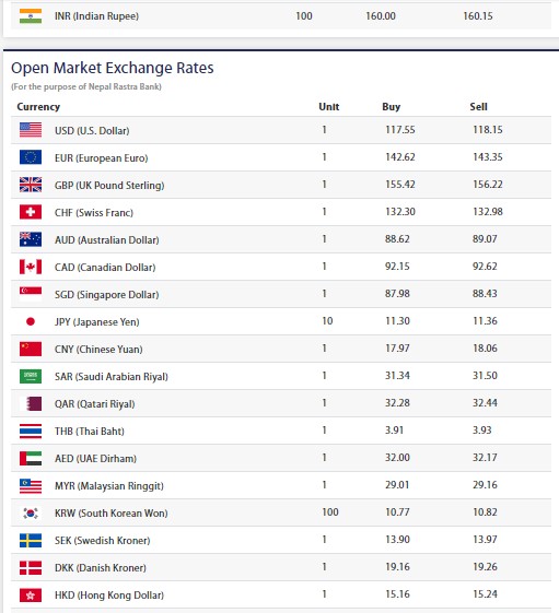 त्यस्तै, युरो एकको खरिददर १ सय ४२ रुपैयाँ ६२ पैसा र बिक्रीदर १ सय ४३ रुपैयाँ ३५ पैसा रहेको छ । यसैगरी पाउण्ड एकको खरिददर १ सय ५५ रुपैयाँ ४२ पैसा र बिक्रीदर १ सय ५६ रुपैयाँ २२ पैसा रहेको छ ।