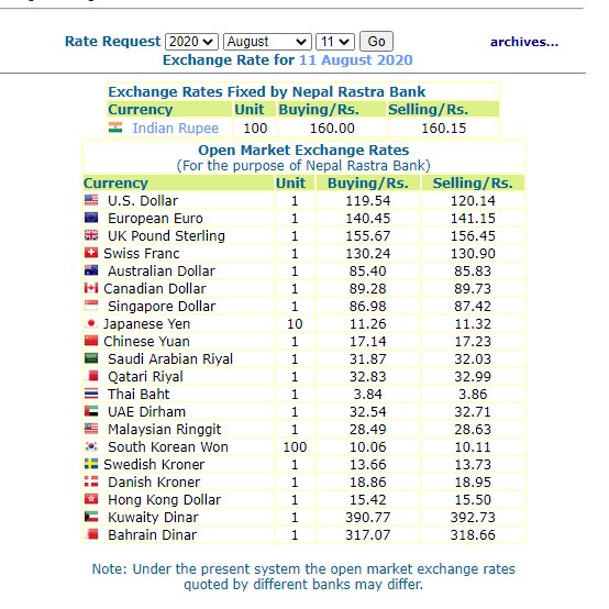 काठमाडौं । नेपाल राष्ट्र बैंकका अनुसार आज एक अमेरिकी खरिददर डलरको मूल्य १ सय १९ रुपैयाँ ५४ पैसा र बिक्रिदर १ सय २० रुपैयाँ १४ पैसा रहेको छ ।