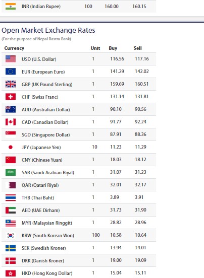 त्यस्तै, यूरोपियन यूरोको खरिददर १ सय ४१ रुपैयाँ २९ पैसा र बिक्रिदर १४२ रुपैयाँ २६ पैसा रहेको छ । यूको पाउन्ड स्टिलिङको खरिददर १ सय ५९ रुपैयाँ ६९ पैसा र बिक्रिदर १६० रुपैयाँ ५१ पैसा रहेको छ ।