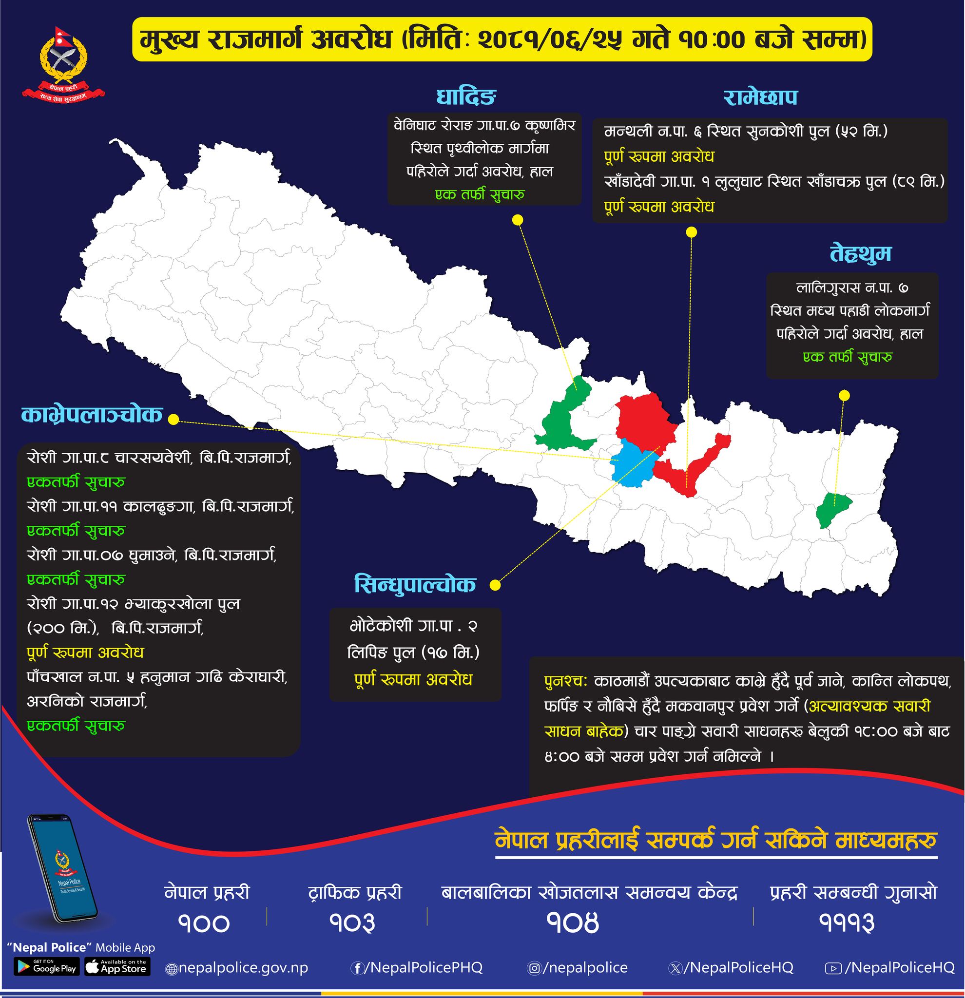 नेपाल प्रहरीका अनुसार शुक्रबार बिहान १० बजेसम्म काठमाडाैंबाट बाहिरिने विपि राजमार्ग बाहेक सबै राजमार्गहरूबाट सवारी साधन आवागमन नियमित रहेको छ। विपि राजमार्ग जोड्ने काभ्रेको रोशीमा पहिरोका कारण अवरूद्ध सडक खुलाउने प्रयास भइरहेको छ।