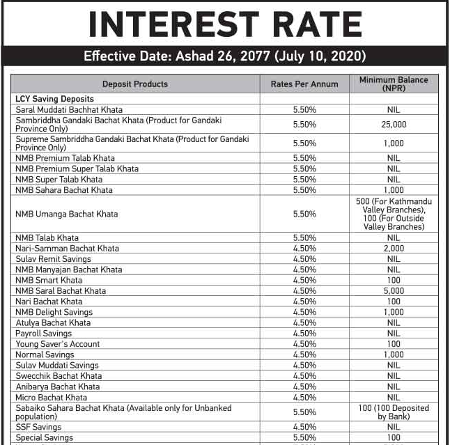 नयाँ ब्याजदर अनुसार बैंकले निक्षेपतर्फ अधिकतम ५ दशमलव ५ प्रतिशत, रिकरिङतर्फ अधिकतम ८ दशमलव २५ प्रतिशत, र मुद्दातितर्फ अधिकतम ८ दशमलव २५ प्रतिशत ब्याज प्रदान गर्ने जनाएको छ ।