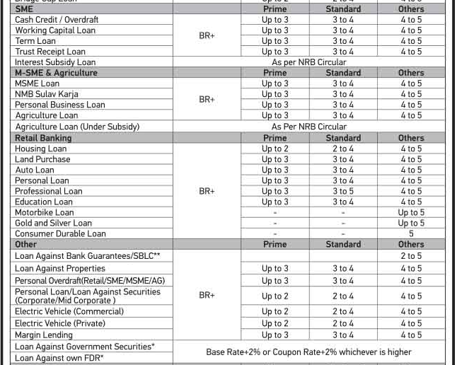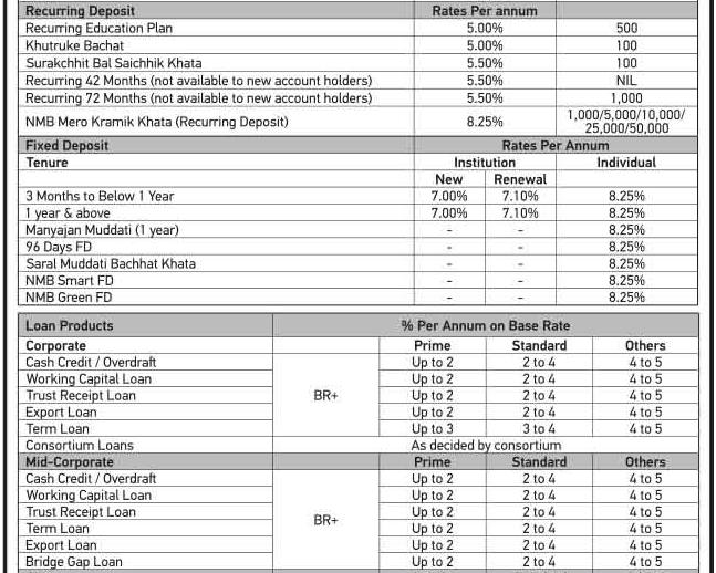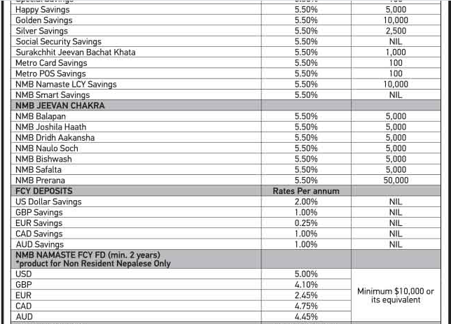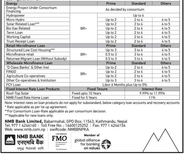 काठमाडौं । एनएमबि बैंकले नयाँ ब्याजदर सार्वजनिक गरेको छ । बैंकले निक्षेप र कर्जातर्फ कै ब्याजदर सार्वजनिक गरेको हो । बैंकले सार्वजनिक गरेको नयाँ ब्याजदर आज असार २६ गतेदेखि नै लागु हुने जनाएको छ । बैंकले कर्जातर्फ बेसरेटमा ५ प्रतिशत सम्म र फिक्स्ड तर्फ ११ दशमलव ९९ प्रतिशत ब्याजमा कर्जा दिने जनाएको छ ।